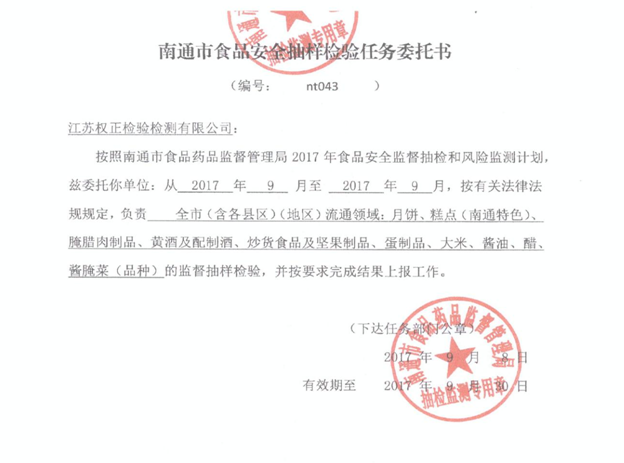 憑借在食品安全抽檢項(xiàng)目方面的專業(yè)技術(shù)和能力,江蘇權(quán)正檢驗(yàn)檢測有限公司承辦了此次“兩節(jié)一會(huì)”食品藥品監(jiān)督管理局食品安全監(jiān)督抽查項(xiàng)目。