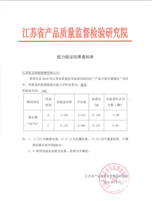 江蘇權正檢驗檢測有限公司于2018年下旬參加了江蘇省質量技術監督局組織的“產品中鉛含量測定”項目,我公司所報送的監測數據及能力評價結果為滿意,兩組樣品的實驗室Z比分數分別為-0.09和0.28(|Z|≤2為滿意結果)。
