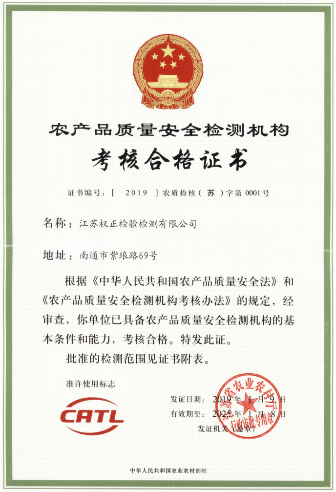 2019年1月9日,江蘇權正檢驗檢測有限公司正式獲得由江蘇省農業委員會頒發的農產品質量安全檢測機構考核合格證書(CATL) [2019]農質檢核(蘇)字第0001號。