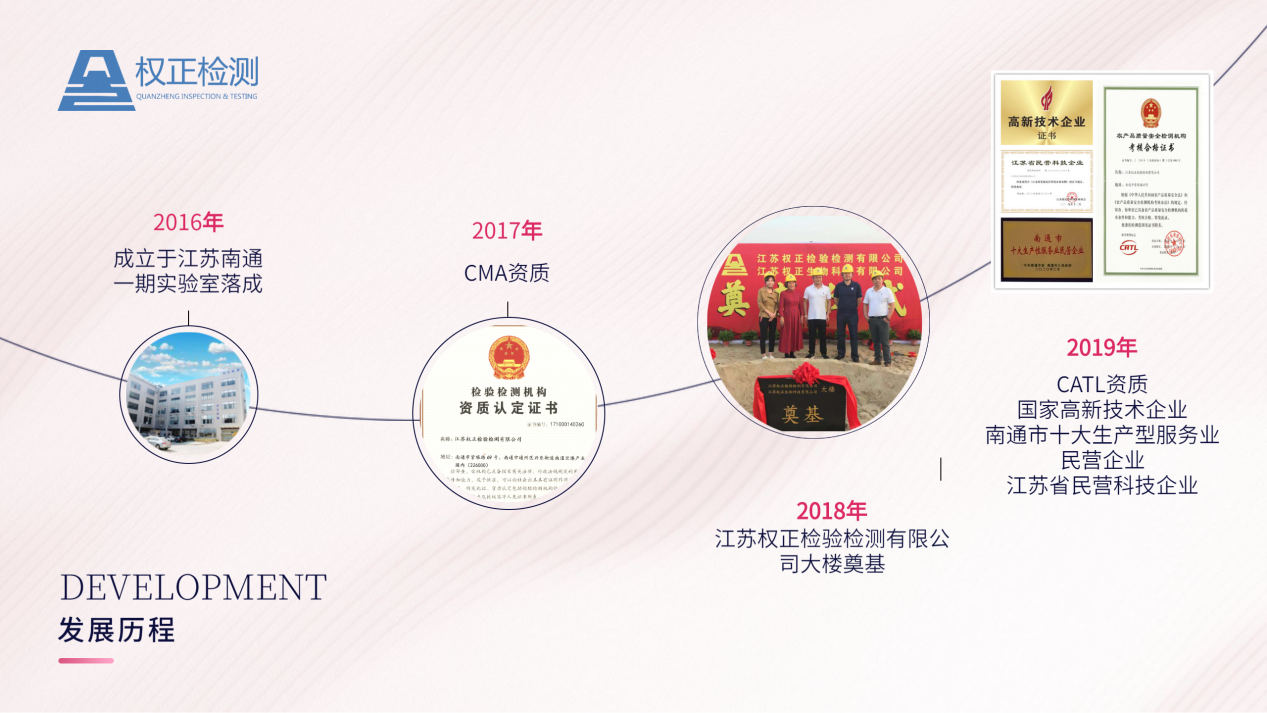 2017年4月22日,剛滿周歲的江蘇權(quán)正迎來了江蘇省檢驗(yàn)檢測(cè)機(jī)構(gòu)資質(zhì)認(rèn)定現(xiàn)場(chǎng)評(píng)審,并順利取得CMA資質(zhì)認(rèn)定證書。2018年9月30日,江蘇權(quán)正檢驗(yàn)檢測(cè)有限公司大樓奠基。2018年12月,江蘇權(quán)正再次接受農(nóng)產(chǎn)品質(zhì)量安全檢測(cè)機(jī)構(gòu)考核現(xiàn)場(chǎng)評(píng)審,并于3周歲前獲取了CATL資質(zhì)認(rèn)定證書。一年后,江蘇權(quán)正順利通過國(guó)家高新技術(shù)企業(yè)認(rèn)定,被評(píng)為南通市十大生產(chǎn)型服務(wù)業(yè)名營(yíng)企業(yè)、江蘇省民營(yíng)科技企業(yè)。