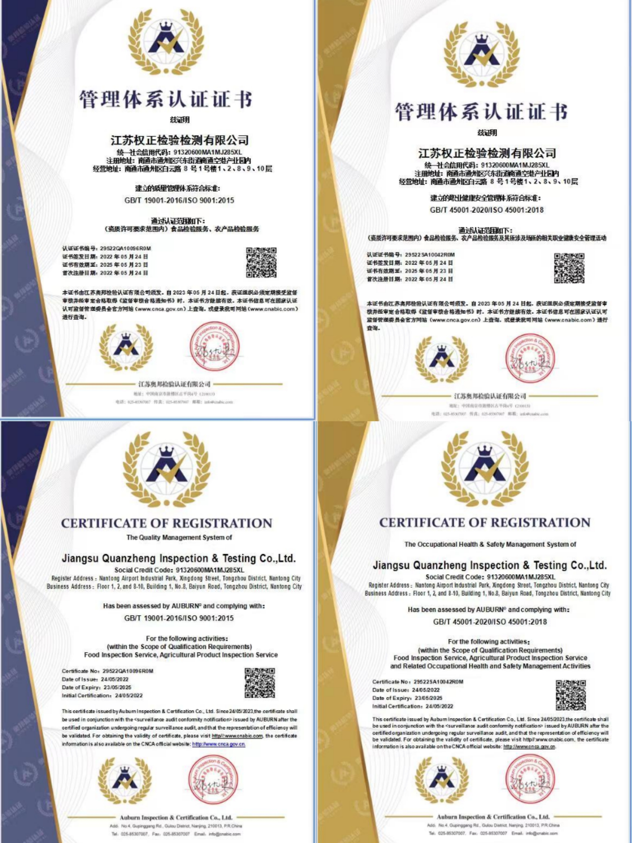 近期,在各部門的共同努力和配合支持下公司順利通過兩大管理體系的專項審核,喜獲ISO 9001:2015質(zhì)量管理體系認證證書和ISO 45001: 2018職業(yè)健康安全管理體系認證證書,這標志著江蘇權(quán)正在食品、農(nóng)產(chǎn)品等檢驗檢測方面的規(guī)范化和標準化管理達到新的水平。